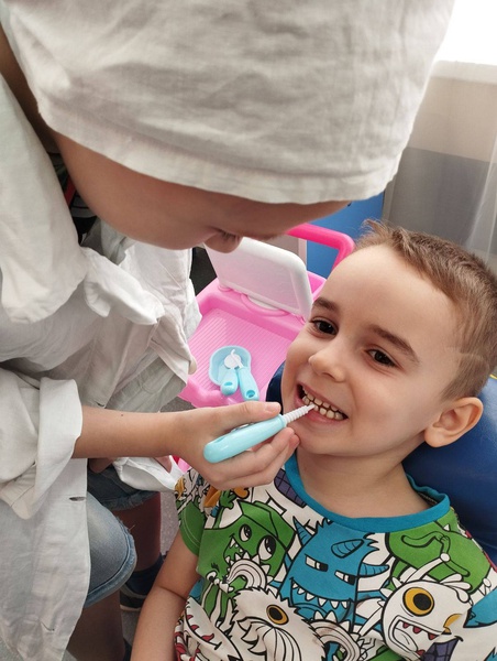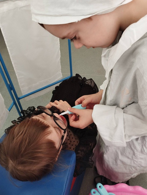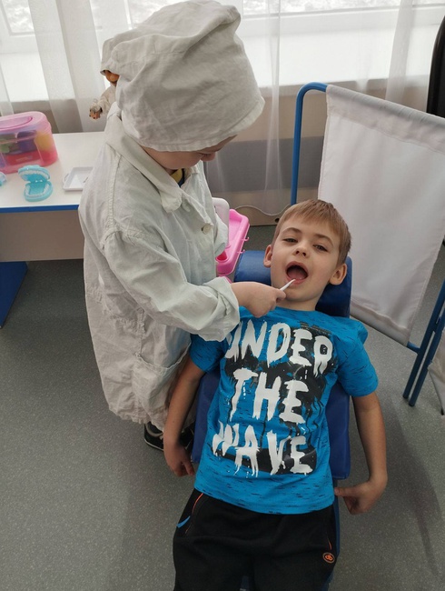 В сюжетно ролевой игре "Больница: стоматолог" ребята познакомились с профессией стоматолога. В предварительной беседе ребята закрепили знания о том как надо сохранять свои зубки, какие правила соблюдать , чтоб обезопасить и не повредить их. Ребята продолжили учится распределять между собой роли: пациент, медсестра, стоматолог и брать на себя ответственность за выбранную роль , выполняя определенные действия в соответствии с ролью. Ребята пополнили словарь новыми словами: стоматологический кабинет, полость рта, зубная эмаль, кариес, пинцет, зонд, бур, лоток для инструментария. Ребятам очень понравилась играть в стоматологов , решили включить эту должность в наш медицинский центр "ПРОздоровье".
