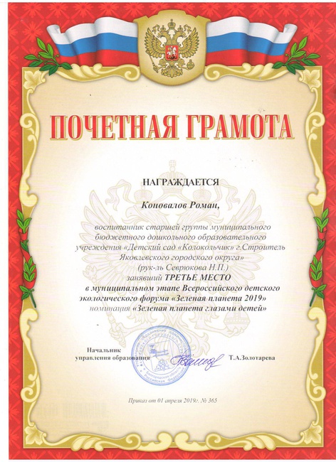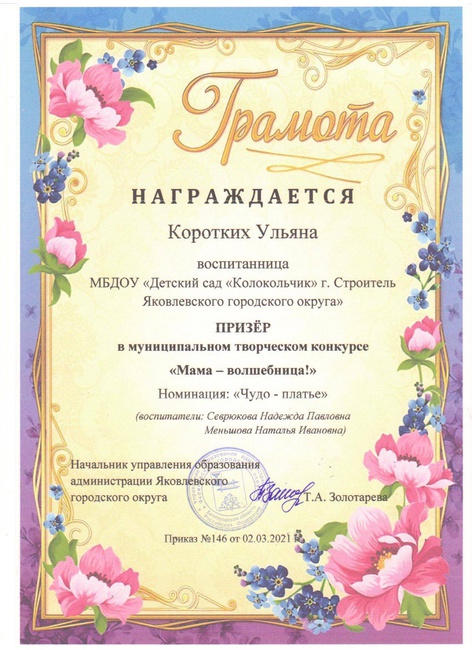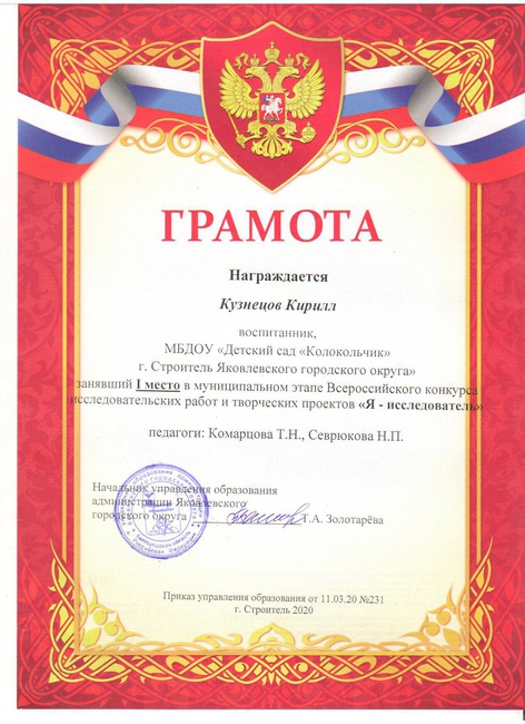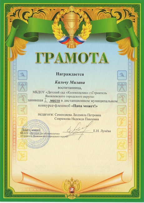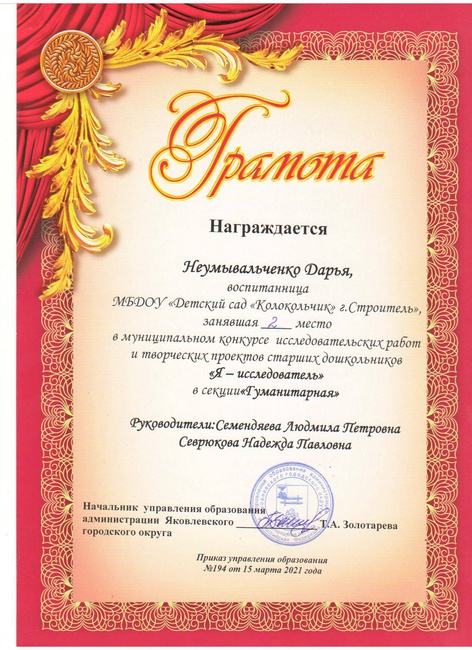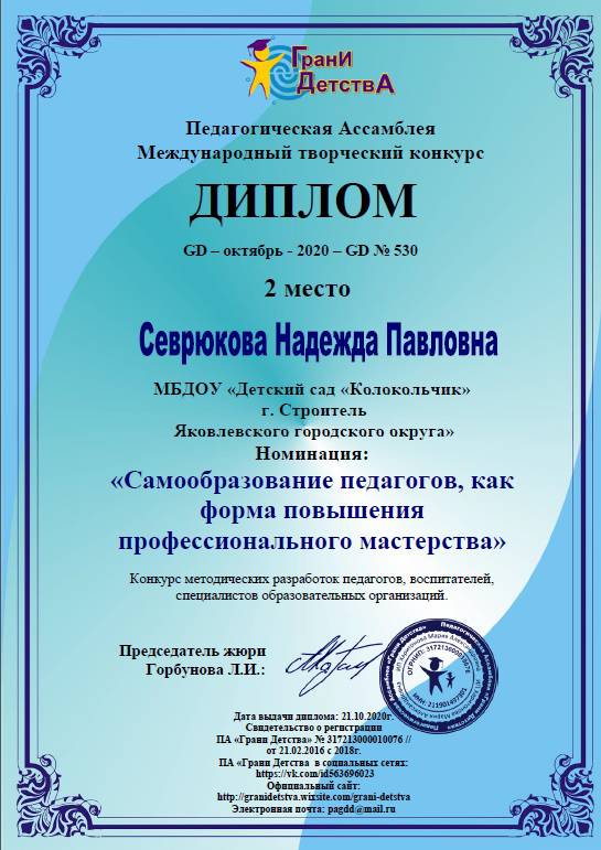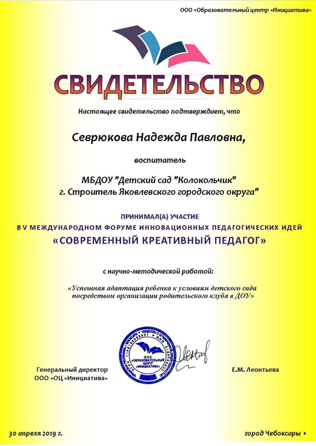 1.Свидетельство о публикации в v международном форуме инновационных педагогических идей « Современный креативный педагог» с научно-методической работой: «Успешная адаптация ребенка к условиям детского сада посредством организаций родительского клуба в ДОУ» 30 апреля 2019 года.