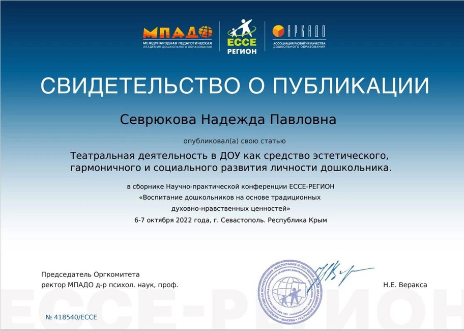 2.Свидетельство о публикаций в сборнике Научно-практической конференций ЕССЕ-РЕГИОН «Воспитание дошкольников на основе традиционных духовно-нравственных ценностей» 6-7 октября 2022 года.